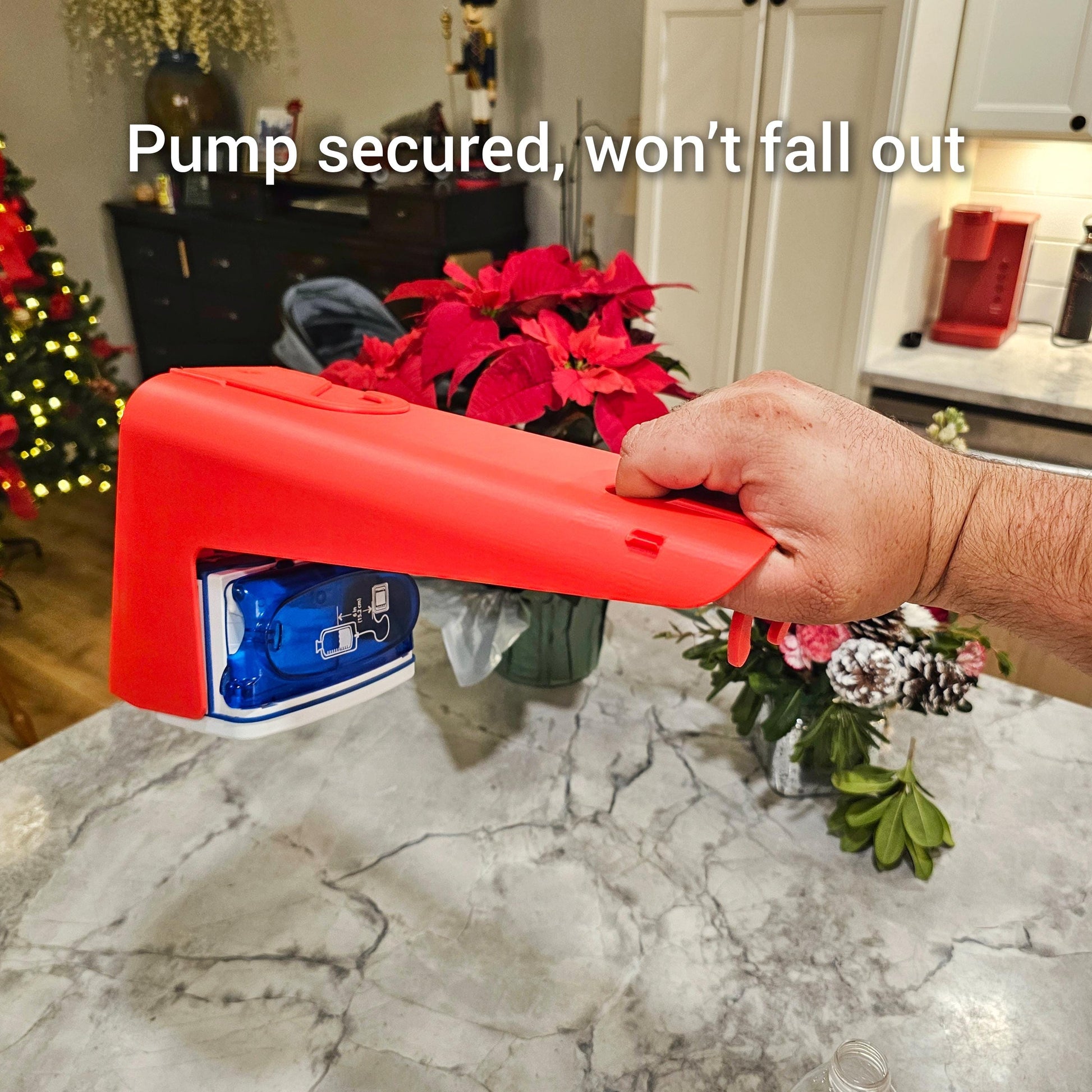 The feeding bag hangs on a hook behind the pump, keeping the stand height minimal. Silicone feet prevent slipping and allow for easy one-handed button operation.